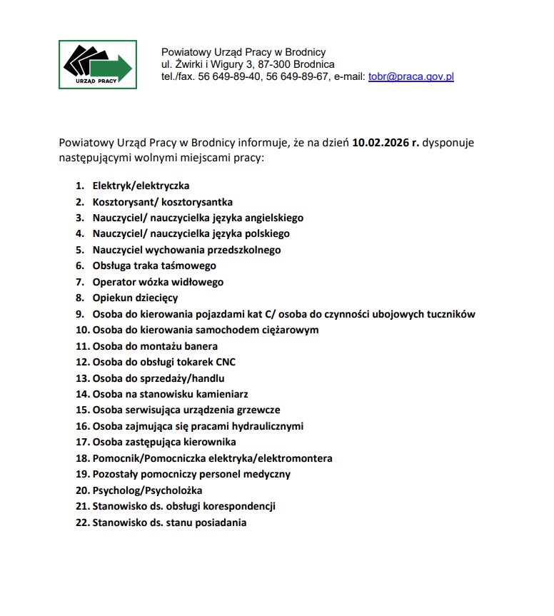 Informacja o Wolnych Miejscach Pracy - 10 Luty 2026