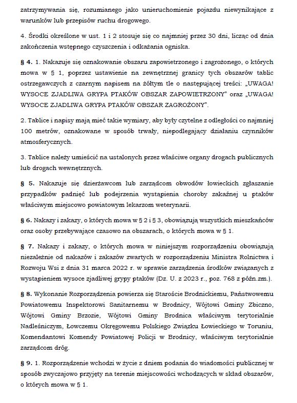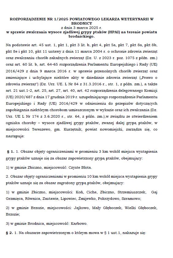 W dniu 3 marca 2025 roku Powiatowy Lekarz Weterynarii w Brodnicy wydał Rozporządzenie nr 1/2025 w sprawie zwalczania wysoce zjadliwej grypy ptaków (HPAI) na terenie powiatu brodnickiego. W związku z tym hodowcy drobiu są zobowiązani do przestrzegania zaleceń zawartych w ulotce dla hodowców drobiu.
